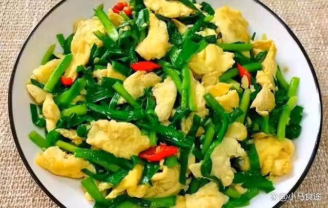 3.鍋里熱油,倒入韭菜根翻炒幾下炒變色,倒入韭菜葉翻炒幾下,倒入炒好的雞蛋,加入少許小米辣圈翻炒均勻,調入少許鹽和生抽,翻炒均勻,即可裝盤。