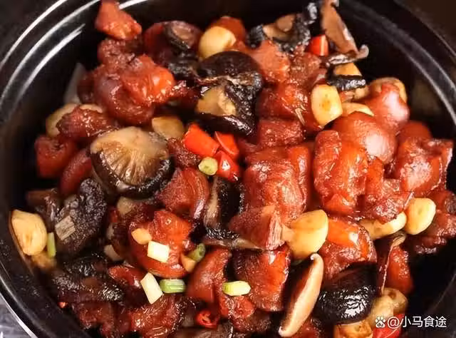 3.另起鍋,加入少量色拉油燒熱,下入薑片、蒜瓣和大蔥片爆香,倒入壓好的拐肉塊,放入發好的小香菇,調入美極鮮和辣鮮露,一起炒香入味,淋入藤椒油,撒入小米椒節,翻炒均勻,出鍋裝盤,美味即成。
