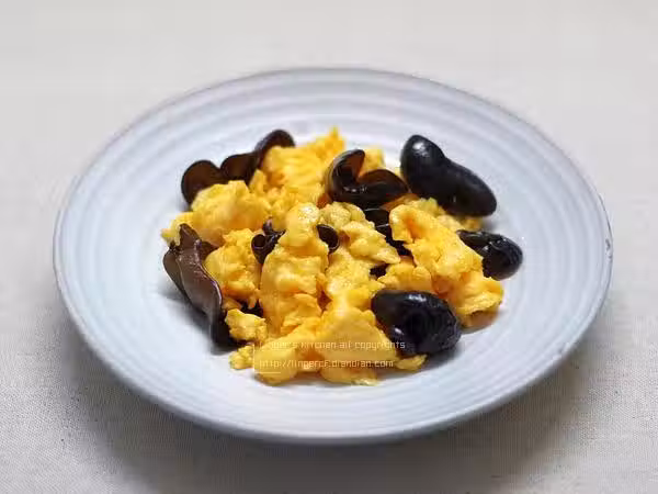 原鍋倒入木耳翻炒,調入少許鹽和生抽,千萬別多放;加1勺(家裡喝湯用的勺)清水,旺火翻炒至水份將干,熄火倒入雞蛋炒勻即可。