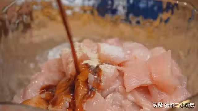 2、下面來腌制雞肉,加入食用鹽,來點胡椒粉去腥,再來些少許生抽醬油,再來一點點的料酒下手給它抓一下,多抓一會要讓肉充分吸收調料,那樣味道才更加的足,接著撒入少量的玉米澱粉,再次用手給它抓拌均勻,要讓每一塊雞胸肉都裹上澱粉,接著撒入少許食用油,用食用油鎖住食材的味道,炒制的時候也不容易粘連,然後腌腌制上15分鐘。