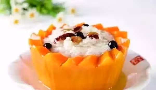 將老南瓜洗淨,在蒂部挖開去瓤,然後將糯米、果仁、豆沙、白糖、桂花等拌勻裝入瓜內,再將瓜蓋好固定,上籠屜蒸至米熟瓜爛即可。