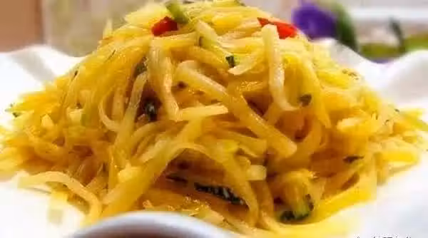 1、馬鈴薯、南瓜、青紅椒分別切絲。