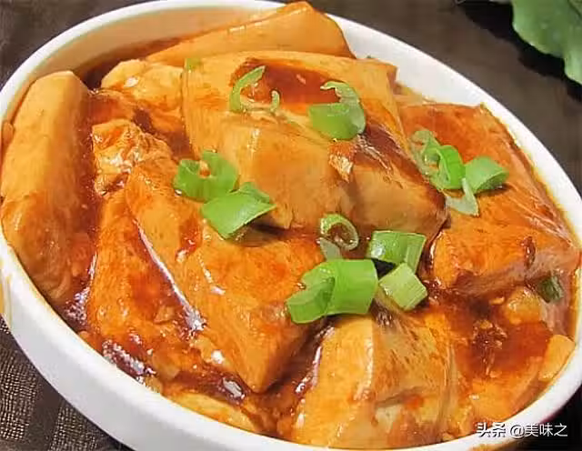 豆腐500克、蔥適量、姜適量、蒜適量、鹽適量、海天辣黃豆醬10克、老抽5克、生抽5克、糖3克、水澱粉適量、香油適量。