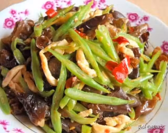 豆角150克、雞肉100克、黑木耳少許、杭椒3個、姜小塊、蒜2瓣、油2茶匙、鹽少許、胡椒少許、郫縣豆瓣1茶匙。