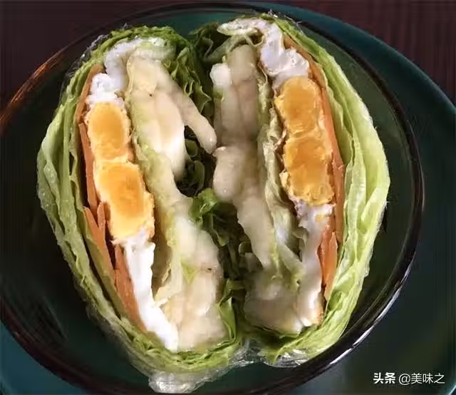 6、煎好的雞蛋放胡蘿蔔上,再放一些生菜。