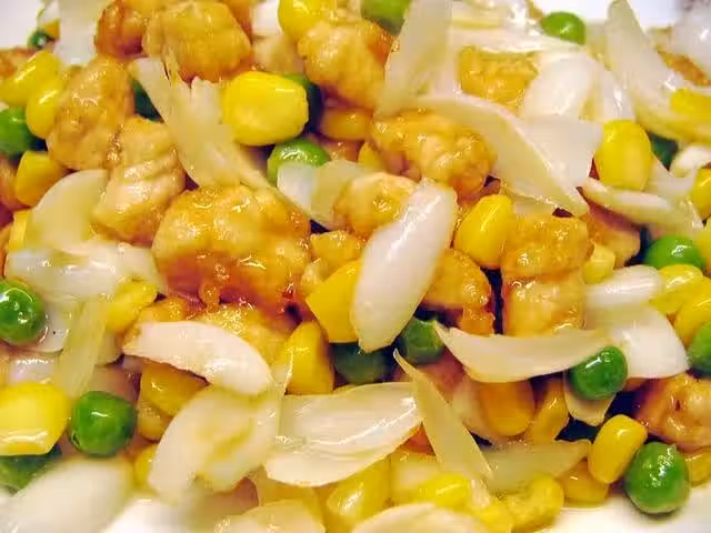 放入百合、玉米、青豆,加鹽翻炒2分鐘就可以裝盤了。(喜歡吃辣的朋友可以加點辣椒)