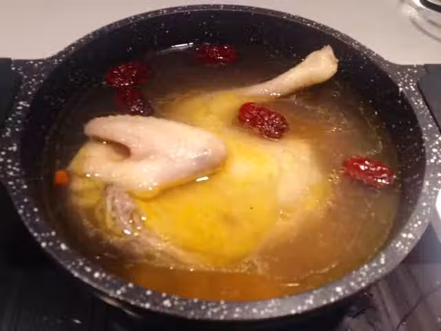把雞整塊放開水裡燙一下,然後另起一個砂鍋,砂鍋不要比雞大太多,這樣的湯水煮出來都是精華。雞放進去,放水剛好蓋過雞,開中火煮