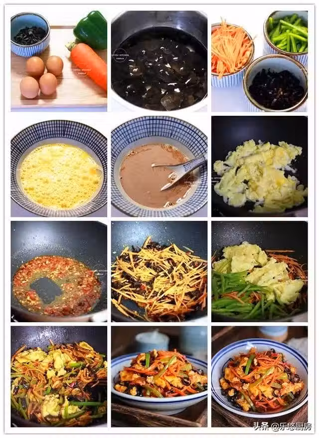 第八步:把胡蘿蔔絲、木耳絲放入鍋中煸炒1分鐘左右。