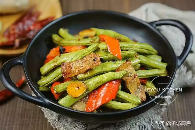 第一步:準備食材。豆角400克、五花肉200克、紅辣椒1個、蒜適量、姜適量。