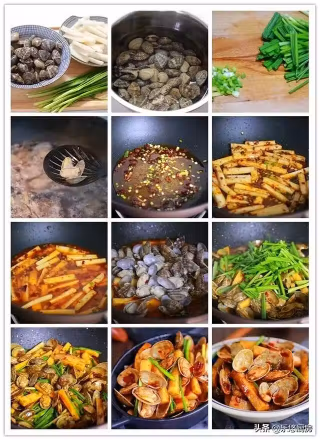 第八步:把花蛤放入鍋中,翻炒均勻,然後放入1勺生抽、1勺蚝油、少許白糖、少許鹽翻炒均勻調味。