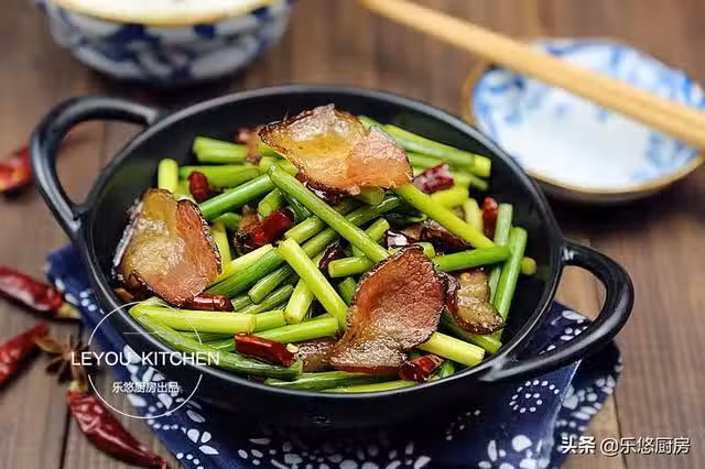 第一步:準備食材。臘肉1塊、蒜苔1把、姜適量、蒜適量、干辣椒適量。