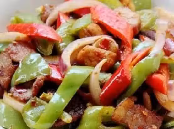 準備食材:五花肉、青紅椒、洋蔥、豆瓣醬、白糖、生薑、陳醋、鹽、油。