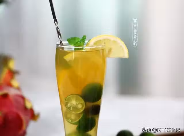 第三步:黃檸檬和小青檸切塊,把籽用牙籤挑掉,準備一個大的涼水杯,先放入小青檸和黃檸檬,再倒入煮好的水果茶後再加一些冰塊混合均勻就可以開始享用夏日營養水果茶啦。煮水果的食材也可選擇自己喜歡的水果來放