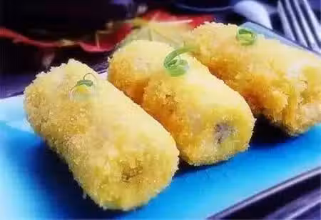 材料:2根香蕉、2個雞蛋、2包蛋卷、適量麵包糠、少許鹽、適量白糖。