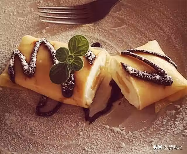 雞蛋1粒、鮮橙汁30G、牛奶210G、低筋粉80G、黃油10G、糖粉20G、芒果1顆、淡奶油適量、巧克力醬適量、糖粉適量。