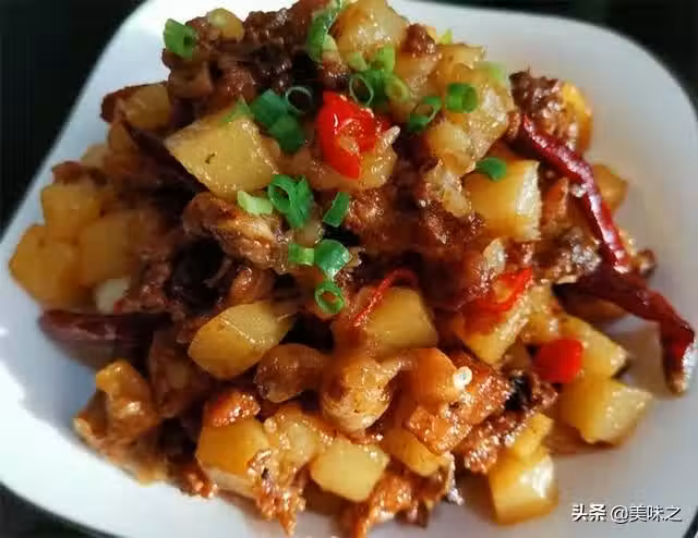 雞半隻、土豆1個、紅辣椒2個、干辣椒3個、香蔥1顆、植物油10g、鹽5g、老抽少許、生抽1勺。