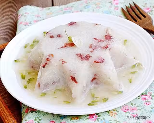 6、米糊冷卻下,倒入槐花水,放冰箱冷藏下,取出脫模。