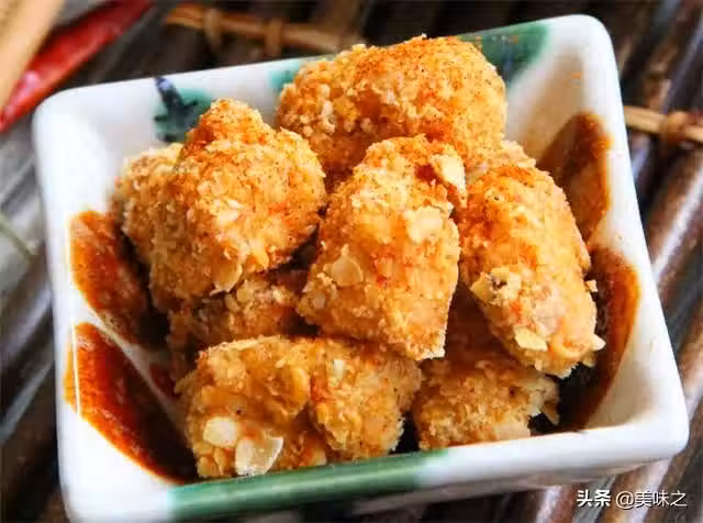 5、取適量燕麥碎(將燕麥片適度碾碎成小顆粒代替麵包糠),將雞丁在燕麥碎中滾幾圈,均勻裹上燕麥碎。