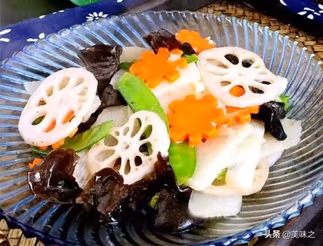 蓮藕100g、山藥120g、泡發黑木耳100g、胡蘿蔔40g、荷蘭豆50g、生粉少許、色拉油適量、砂糖半小勺、蒜瓣2個、鹽少許、美極鮮味汁5ml。