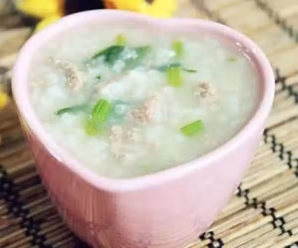 4、牛肉糜加入少許的鹽醃5分鐘後,倒入煮好的白粥中;