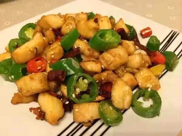 用料:雞胸脯肉2片、柿子椒3個、蔥2節、干辣椒4根、料酒2湯匙、生抽1湯匙、米醋2湯匙、澱粉1湯匙、豆瓣醬2湯匙、白糖1茶匙、辣醬1湯匙