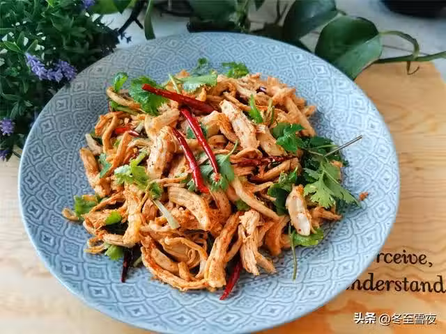 【涼拌麻辣雞絲】所需材料:雞胸肉2塊、香菜1棵、油鹽適量、香油1湯匙、蔥1段、姜2片、料酒1湯匙、生抽醬油2湯匙、干辣椒5-6個、辣椒粉2茶匙、白糖半湯匙、麻椒20粒左右、