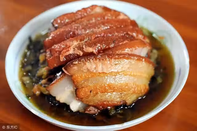 8、均勻鋪上煸炒後的梅乾菜,放八角,入鍋蒸40分鐘。