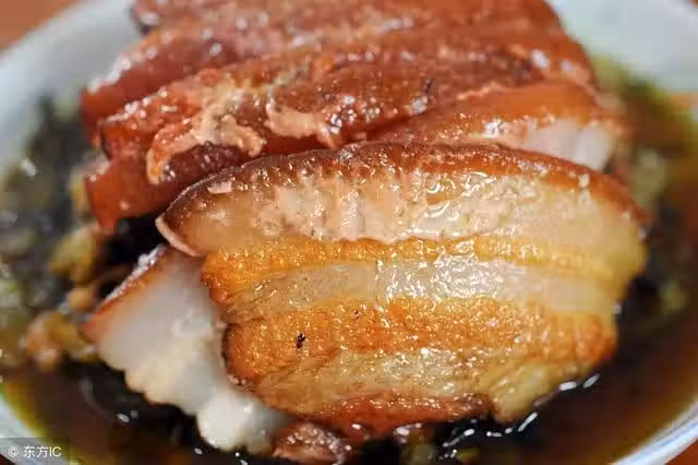 4、將炸好的五花肉改成9厘米長、0.2厘米厚的大片,皮面朝下碼入碗內,加醬油、料酒、花椒水、蔥段、姜塊、肉湯250克、大料、白糖,上屜蒸爛;