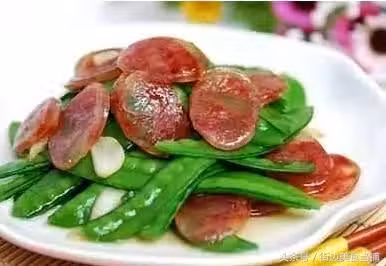 1,摘好荷蘭豆,臘腸切片,黃椒切絲,蒜拍扁。