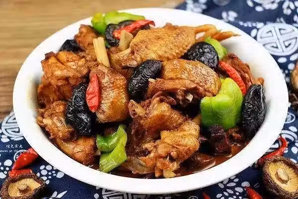 煸炒至雞皮起黃色邊,倒入料酒,少許醋,一點點糖,老抽並翻炒上色。這時倒入香菇,並再次翻炒均勻。