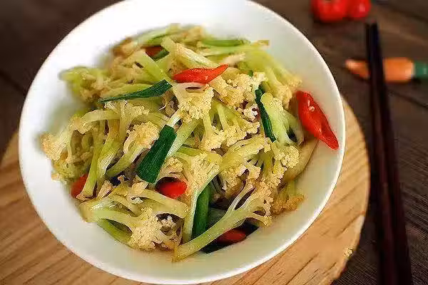 幾秒就好馬上倒入花菜,迅速翻炒,加入蒜瓣
