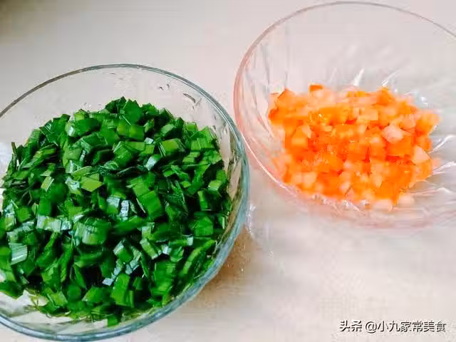 3.將準備好的韭菜和番茄末一同放入碗里,再加入一點食鹽,充分攪勻