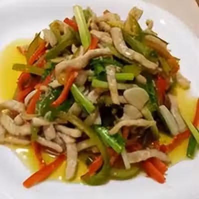 2. 炒鍋置旺火上,下入五花肉絲煸炒炒出油脂,下入豆豉、蒜片炒到肉絲微微變色,調入醬油、料酒,九成熟的時候下入青椒絲翻炒,調入鹽、味精、少許胡椒粉翻炒均勻出鍋裝盤即可。