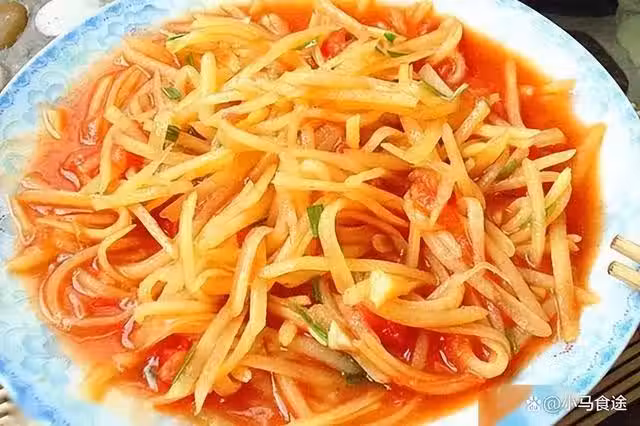 2.起鍋燒油,下入蔥花爆香,下入西紅柿丁炒香,調入少許鹽、生抽、少許胡椒粉炒入味,再下入土豆絲充分翻炒均勻,即可出鍋裝盤。