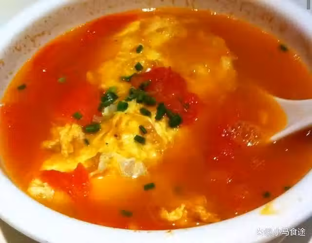 西紅柿煎蛋湯,湯色紅潤,雞蛋經過炸制,再放入湯中浸煮,配點細麵條更好吃。