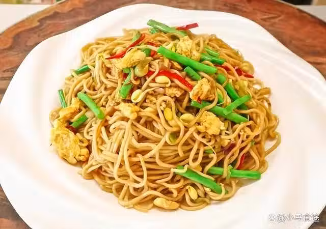 家常雞蛋炒麵,蛋炒麵的一種,這款蛋炒麵口感層次多,麵筋,雞蛋香,黃豆芽和豇豆吃著清脆,看著簡單吃著香。