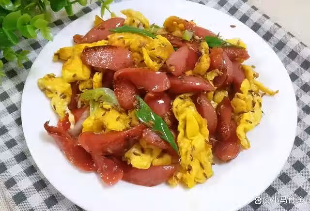 3.再起鍋燒油,下入脆皮腸炒香,加入少許孜然顆粒炒香,烹入醬油、下入雞蛋和蒜苗,炒勻炒香,即可出鍋裝盤。