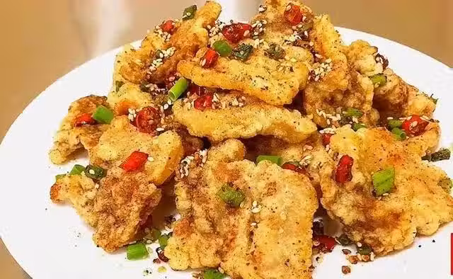 香酥五花肉,這道菜的做法由小酥肉改變而來,五花肉裹上脆皮糊,過油炸至金黃酥脆,吐掉裡面的肥油,再二次加工干煸一下,焦香酥脆,麻辣適口,可以撒點燒烤料,肉味更香韌。