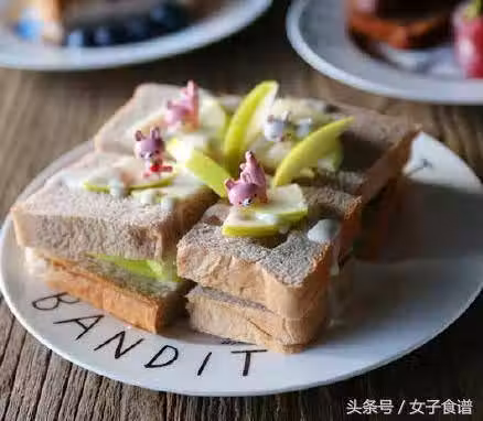 2. 把吐司切成四份淋上酸黃瓜沙拉醬,點綴上青蘋果碎