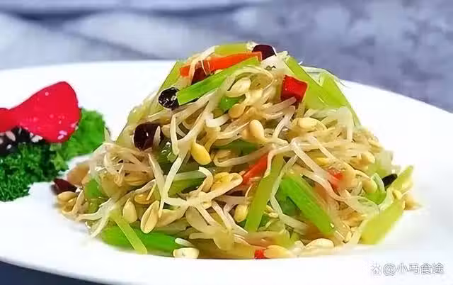 熗拌芹菜黃豆芽,黃豆芽清脆爽口,做涼拌菜也特別好吃,搭配芹菜用熗拌的形式,好吃易做,香氣撲鼻,特別爽口。