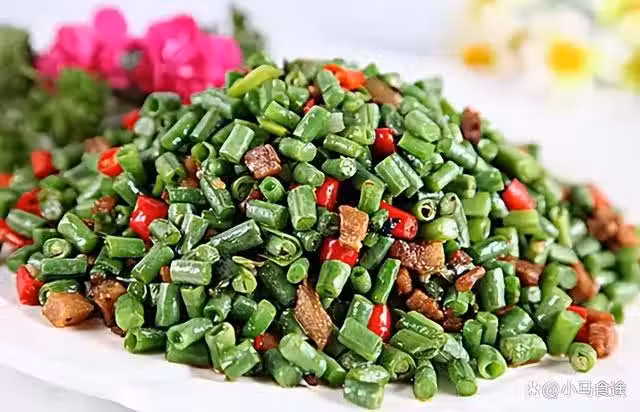 1.豇豆摘洗乾淨改刀切丁,先倒入開水鍋里燙一下,色澤更翠綠,再過一下油或者干煸一下,起虎皮會更干香。