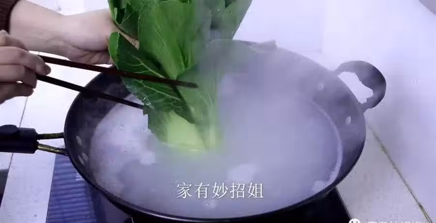 燙的時間不要太長,大概十幾秒,看到菜葉變色了,我們就可以將它撈起來了。要是燙的時間太長,酸菜做出來就會爛掉。我們按同樣的方法把剩下的青菜都燙好。