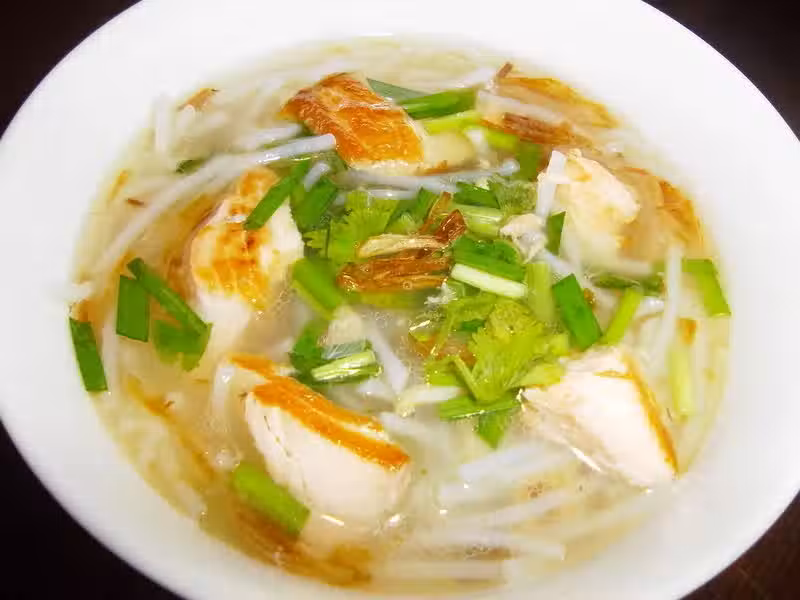 5、取一湯碗,加入油蔥酥+韭菜末+香菜末在碗底,米粉湯裝入碗中,再將剛剛剝下的魚肉塊擺上就OK囉~^^
