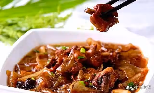 4.雞塊燉至七成熟,下入粉皮泡透,再燜五分鐘,湯汁黏稠,即可出鍋裝盤。