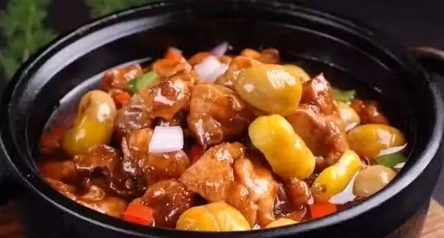 2.凈鍋放油燒熱,下入土雞塊炒干水汽,再加入泡椒末、豆瓣醬、生薑米炒香,放入板栗,摻入鮮湯並加少許鹽和味精,燜至雞塊熟時,下入青紅椒塊和洋蔥塊,勾芡後淋陳醋,起鍋裝砂煲即成。