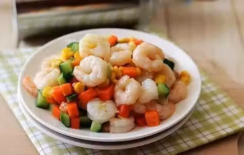 5,另起鍋加入少許油,將胡蘿卜和黃瓜丁下鍋炒至斷生,加入少許鹽,加入玉米粒翻炒,然後加入事先炒好的蝦仁,翻炒均勻,出鍋裝盤。