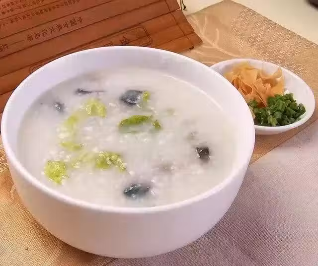 4、水煮開,下米煮滾後改小火,加入皮蛋、瘦肉絲、鹽、雞精、蔥花,煮約50分鐘後,放入餘下的皮蛋塊和蔥花,微火煮10分鐘即可。