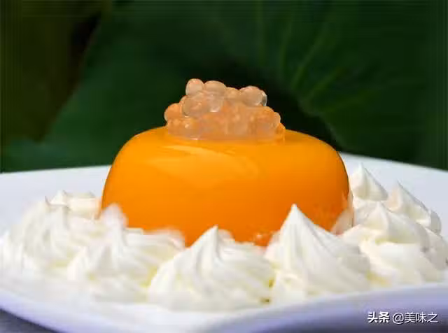 6、把冷藏凝固的芒果味布丁反扣在盤中,擠上淡奶油。