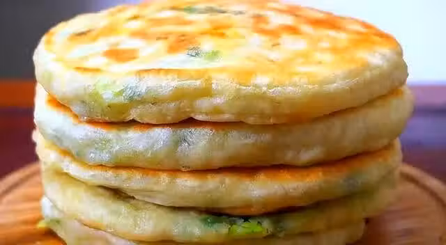 發麵油餅,準備適量溫水,加入少許酵母粉,打入兩個雞蛋攪拌均勻,分次倒入麵粉中,攪和成軟麵糰,蓋住醒發至兩倍大。再加入火腿丁、蔥花、韭菜、鹽、味精、雞精、胡椒粉、少許食用油充分攪拌均勻,再進行二次醒發20分鐘。