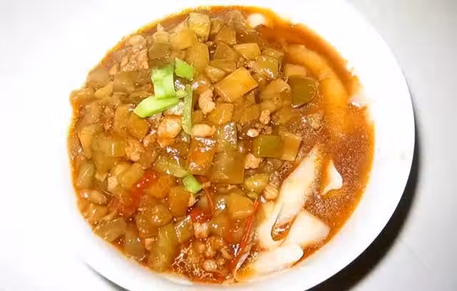 起鍋燒油,下入肉末炒酥香,下入蔥薑末爆香,烹入料酒,下入茄子炒蔫兒,下入西紅柿丁炒出濃汁,加入適量清水燒開,調入鹽、味精、胡椒粉、醬油、花椒粉、姜粉燒至入味,勾入水澱粉,汁濃稠即可出鍋,澆在煮熟的麵條上,美味即成。